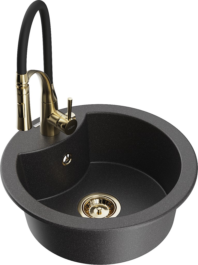 Technické dáta: drez: Rozmery: 488 x 488 x 167 mm Hĺbka komory: 157 mm Šírka komory: 406 mm Priemer odtoku: ø90 mm Typ: 1-komorový Typ: Zapustené do pracovnej dosky Farba: Škvrnitá čierna Povrchová úprava sifónu: zlatá Materiál: žula (80% žulové kamenivo, 20% živice) Prepadový otvor: Áno Otvory: (batérie, automatické) 2 Vysoká odolnosť proti poškriabaniu a zmene farby Odolnosť proti tepelným šokom Ľahko čistiteľný povrch Jeden dodatočný vyfrézovaný otvor na samodierovanie ø35 kuchynská batéria: Materiál: mosadz Farba: Zlatá/Čierna Hlava: Keramická Prevzdušňovač: Áno Typ: Jedna páka Výška batérie: 430 mm Rozsah výtoku: 185 mm Batéria má výsuvný výtok(GT) Ean: 5905315046628