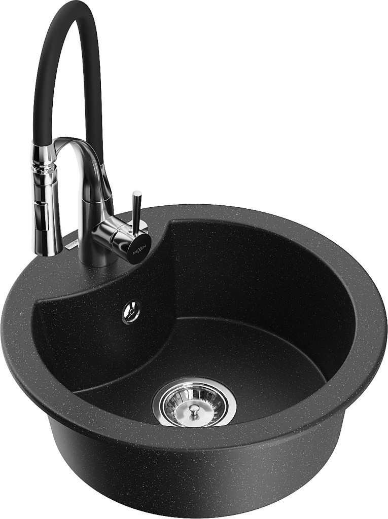 Technické dáta: drez: Rozmery: 488 x 488 x 167 mm Hĺbka komory: 157 mm Šírka komory: 406 mm Priemer odtoku: ø90 mm Typ: 1-komorový Typ: Zapustené do pracovnej dosky Farba: čierna/strieborná metalíza Povrchová úprava sifónu: Chrome Materiál: žula (80% žulové kamenivo, 20% živice) Prepadový otvor: Áno Otvory: (batérie, automatické) 2 Vysoká odolnosť proti poškriabaniu a zmene farby Odolnosť proti tepelným šokom Ľahko čistiteľný povrch Jeden dodatočný vyfrézovaný otvor na samodierovanie ø35 kuchynská batéria: Materiál: mosadz Farba: chróm/čierna Hlava: Keramická Prevzdušňovač: Áno Typ: Jedna páka Výška batérie: 430 mm Rozsah výtoku: 185 mm Batéria má výsuvný výtok(GT) Ean: 5905315046482