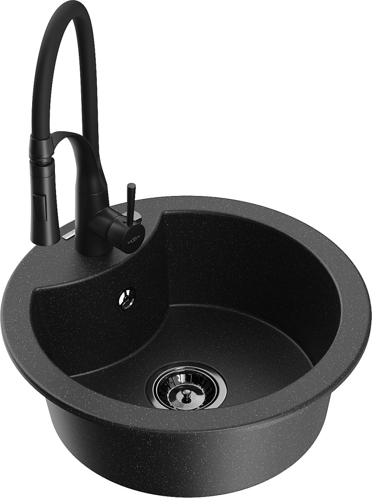 Technické dáta: drez: Rozmery: 488 x 488 x 167 mm Hĺbka komory: 157 mm Šírka komory: 406 mm Priemer odtoku: ø90 mm Typ: 1-komorový Typ: Zapustené do pracovnej dosky Farba: čierna/strieborná metalíza Povrchová úprava sifónu: čierna Materiál: žula (80% žulové kamenivo, 20% živice) Prepadový otvor: Áno Otvory: (batérie, automatické) 2 Vysoká odolnosť proti poškriabaniu a zmene farby Odolnosť proti tepelným šokom Ľahko čistiteľný povrch Jeden dodatočný vyfrézovaný otvor na samodierovanie ø35 kuchynská batéria: Materiál: mosadz Čierna farba Hlava: Keramická Prevzdušňovač: Áno Typ: Jedna páka Výška batérie: 430 mm Rozsah výtoku: 185 mm Batéria má výsuvný výtok(GT) Ean: 5905315046529