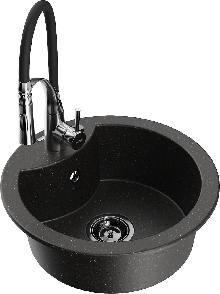 Technické dáta: drez: Rozmery: 488 x 488 x 167 mm Hĺbka komory: 157 mm Šírka komory: 406 mm Priemer odtoku: ø90 mm Typ: 1-komorový Typ: Zapustené do pracovnej dosky Farba: čierna / zlatá metalíza Povrchová úprava sifónu: čierna Materiál: žula (80% žulové kamenivo, 20% živice) Prepadový otvor: Áno Otvory: (batérie, automatické) 2 Vysoká odolnosť proti poškriabaniu a zmene farby Odolnosť proti tepelným šokom Ľahko čistiteľný povrch Jeden dodatočný vyfrézovaný otvor na samodierovanie ø35 kuchynská batéria: Materiál: mosadz Farba: chróm/čierna Hlava: Keramická Prevzdušňovač: Áno Typ: Jedna páka Výška batérie: 430 mm Rozsah výtoku: 185 mm Batéria má výsuvný výtok(GT) Ean: 5905315046550