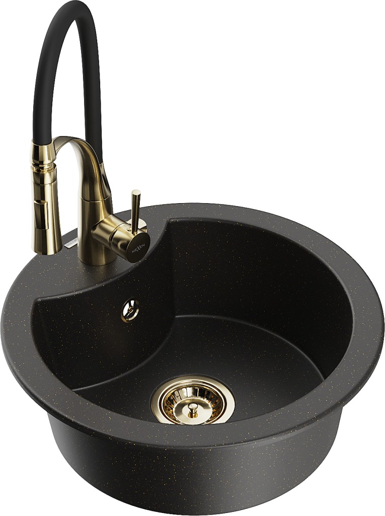 Technické dáta: drez: Rozmery: 488 x 488 x 167 mm Hĺbka komory: 157 mm Šírka komory: 406 mm Priemer odtoku: ø90 mm Typ: 1-komorový Typ: Zapustené do pracovnej dosky Farba: čierna / zlatá metalíza Povrchová úprava sifónu: zlatá Materiál: žula (80% žulové kamenivo, 20% živice) Prepadový otvor: Áno Otvory: (batérie, automatické) 2 Vysoká odolnosť proti poškriabaniu a zmene farby Odolnosť proti tepelným šokom Ľahko čistiteľný povrch Jeden dodatočný vyfrézovaný otvor na samodierovanie ø35 kuchynská batéria: Materiál: mosadz Farba: Zlatá/Čierna Hlava: Keramická Prevzdušňovač: Áno Typ: Jedna páka Výška batérie: 430 mm Rozsah výtoku: 185 mm Batéria má výsuvný výtok(GT) Ean: 5905315046567