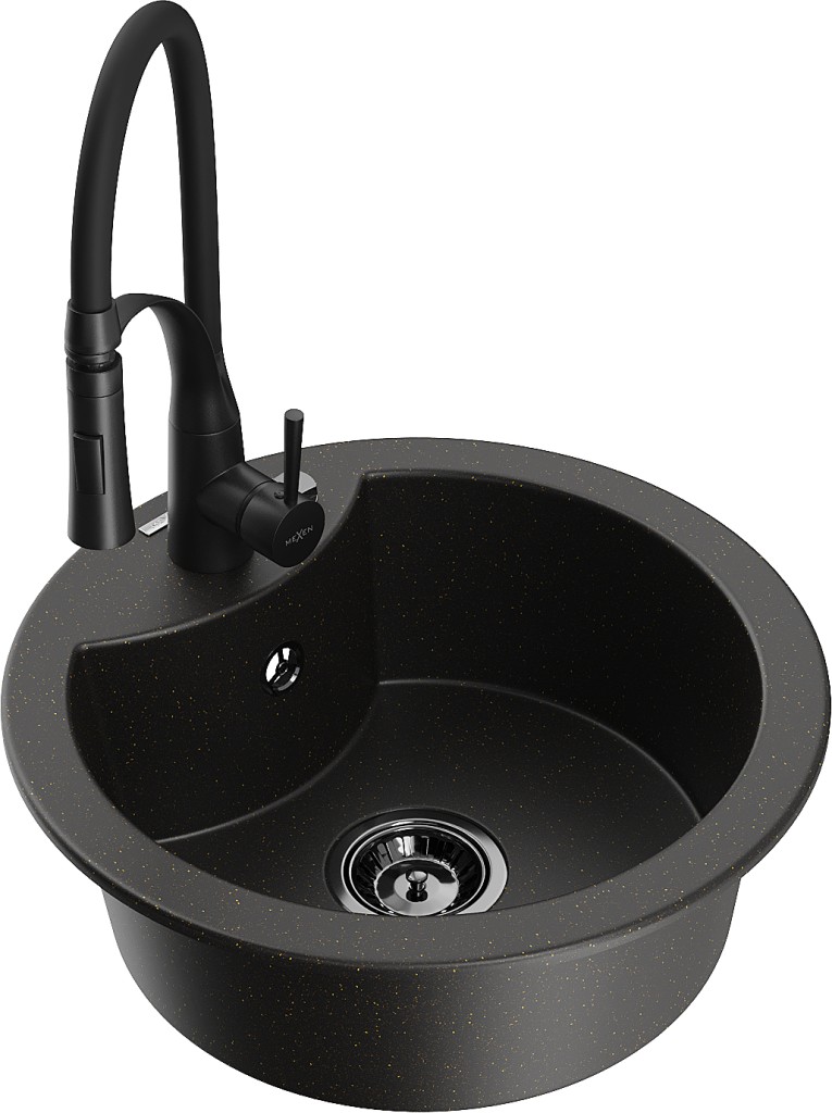 Technické dáta: drez: Rozmery: 488 x 488 x 167 mm Hĺbka komory: 157 mm Šírka komory: 406 mm Priemer odtoku: ø90 mm Typ: 1-komorový Typ: Zapustené do pracovnej dosky Farba: čierna / zlatá metalíza Povrchová úprava sifónu: čierna Materiál: žula (80% žulové kamenivo, 20% živice) Prepadový otvor: Áno Otvory: (batérie, automatické) 2 Vysoká odolnosť proti poškriabaniu a zmene farby Odolnosť proti tepelným šokom Ľahko čistiteľný povrch Jeden dodatočný vyfrézovaný otvor na samodierovanie ø35 kuchynská batéria: Materiál: mosadz Čierna farba Hlava: Keramická Prevzdušňovač: Áno Typ: Jedna páka Výška batérie: 430 mm Rozsah výtoku: 185 mm Batéria má výsuvný výtok(GT) Ean: 5905315046581