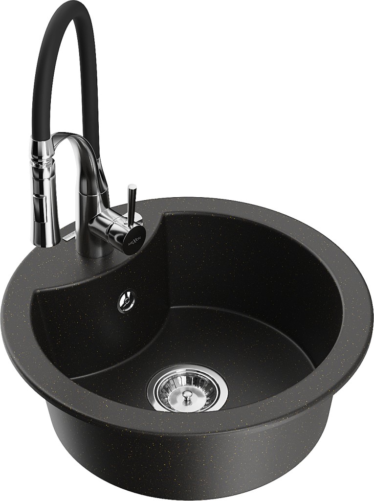 Technické dáta: drez: Rozmery: 488 x 488 x 167 mm Hĺbka komory: 157 mm Šírka komory: 406 mm Priemer odtoku: ø90 mm Typ: 1-komorový Typ: Zapustené do pracovnej dosky Farba: čierna / zlatá metalíza Povrchová úprava sifónu: Chrome Materiál: žula (80% žulové kamenivo, 20% živice) Prepadový otvor: Áno Otvory: (batérie, automatické) 2 Vysoká odolnosť proti poškriabaniu a zmene farby Odolnosť proti tepelným šokom Ľahko čistiteľný povrch Jeden dodatočný vyfrézovaný otvor na samodierovanie ø35 kuchynská batéria: Materiál: mosadz Farba: chróm/čierna Hlava: Keramická Prevzdušňovač: Áno Typ hubica: Flexibilný s mosadzným držiakom Typ: Jedna páka Výška batérie: 430 mm Rozsah výtoku: 235 mm(GT) Ean: 5905315046543
