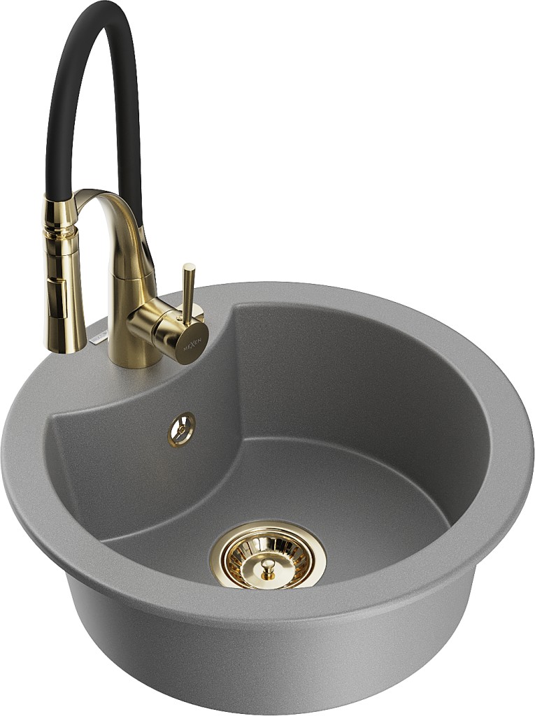 Technické dáta: drez: Rozmery: 488 x 488 x 167 mm Hĺbka komory: 157 mm Šírka komory: 406 mm Priemer odtoku: ø90 mm Typ: 1-komorový Typ: Zapustené do pracovnej dosky Šedá farba Povrchová úprava sifónu: zlatá Materiál: žula (80% žulové kamenivo, 20% živice) Prepadový otvor: Áno Otvory: (batérie, automatické) 2 Vysoká odolnosť proti poškriabaniu a zmene farby Odolnosť proti tepelným šokom Ľahko čistiteľný povrch Jeden dodatočný vyfrézovaný otvor na samodierovanie ø35 kuchynská batéria: Materiál: mosadz Farba: Zlatá/Čierna Hlava: Keramická Prevzdušňovač: Áno Typ: Jedna páka Výška batérie: 430 mm Rozsah výtoku: 185 mm Batéria má výsuvný výtok(GT) Ean: 5905315046444