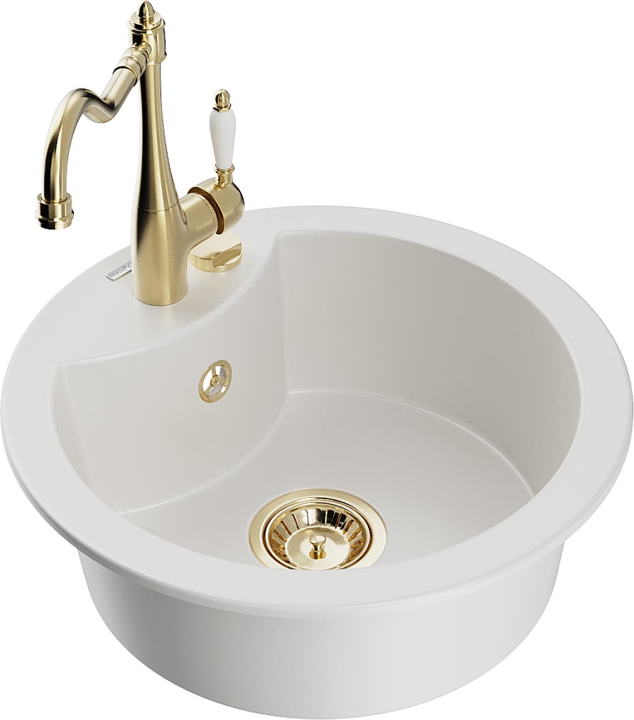 Technické dáta: drez: Rozmery: 488 x 488 x 167 mm Hĺbka komory: 157 mm Šírka komory: 406 mm Priemer odtoku: ø90 mm Typ: 1-komorový Typ: Zapustené do pracovnej dosky biela farba Povrchová úprava sifónu: zlatá Materiál: žula (80% žulové kamenivo, 20% živice) Prepadový otvor: Áno Otvory: (batérie, automatické) 2 Vysoká odolnosť proti poškriabaniu a zmene farby Odolnosť proti tepelným šokom Ľahko čistiteľný povrch Jeden dodatočný vyfrézovaný otvor na samodierovanie ø35 kuchynská batéria: Materiál: mosadz Farba: Zlatá Hlava: Keramická Prevzdušňovač: Áno Typ: Jedna páka Výška batérie: 290 mm Rozsah výtoku: 260 mm(GT) Ean: 5905315040282