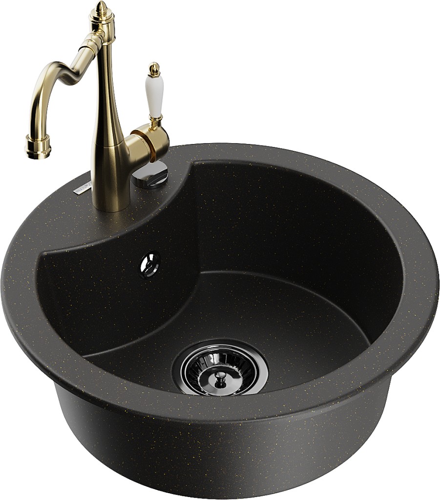 Technické dáta: drez: Rozmery: 488 x 488 x 167 mm Hĺbka komory: 157 mm Šírka komory: 406 mm Priemer odtoku: ø90 mm Typ: 1-komorový Typ: Zapustené do pracovnej dosky Farba: čierna / zlatá metalíza Povrchová úprava sifónu: čierna Materiál: žula (80% žulové kamenivo, 20% živice) Prepadový otvor: Áno Otvory: (batérie, automatické) 2 Vysoká odolnosť proti poškriabaniu a zmene farby Odolnosť proti tepelným šokom Ľahko čistiteľný povrch Jeden dodatočný vyfrézovaný otvor na samodierovanie ø35 kuchynská batéria: Materiál: mosadz Farba: Zlatá Hlava: Keramická Prevzdušňovač: Áno Typ: Jedna páka Výška batérie: 290 mm Rozsah výtoku: 260 mm(GT) Ean: 5905315040459
