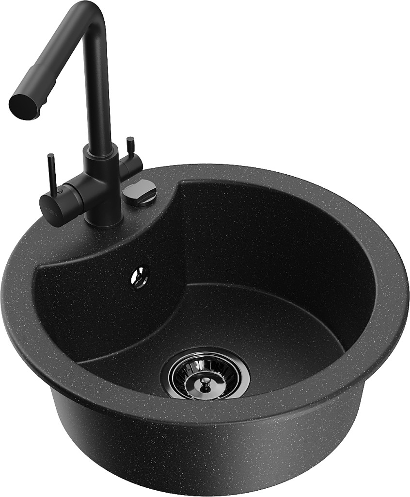 Technické dáta: drez: Rozmery: 488 x 488 x 167 mm Hĺbka komory: 157 mm Šírka komory: 406 mm Priemer odtoku: ø90 mm Typ: 1-komorový Typ: Zapustené do pracovnej dosky Farba: čierna/strieborná metalíza Povrchová úprava sifónu: čierna Materiál: žula (80% žulové kamenivo, 20% živice) Prepadový otvor: Áno Otvory: (batérie, automatické) 2 Vysoká odolnosť proti poškriabaniu a zmene farby Odolnosť proti tepelným šokom Ľahko čistiteľný povrch Jeden dodatočný vyfrézovaný otvor na samodierovanie ø35 kuchynská batéria: Materiál: mosadz Čierna farba Hlava: Keramická Prevzdušňovač: Áno Typ: Dve rukoväte Rozsah výtoku: 235 mm Výška batérie: 315 mm Dvojhlavá batéria s prídavným kanálom pre filtrovanú pitnú vodu(GT) Ean: 5905315025043