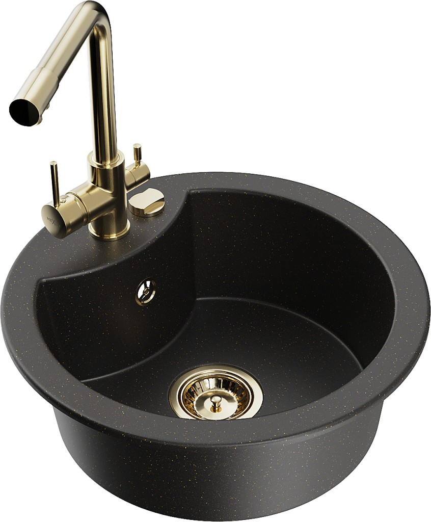 Technické dáta: drez: Rozmery: 488 x 488 x 167 mm Hĺbka komory: 157 mm Šírka komory: 406 mm Priemer odtoku: ø90 mm Typ: 1-komorový Typ: Zapustené do pracovnej dosky Farba: čierna / zlatá metalíza Povrchová úprava sifónu: zlatá Materiál: žula (80% žulové kamenivo, 20% živice) Prepadový otvor: Áno Otvory: (batérie, automatické) 2 Vysoká odolnosť proti poškriabaniu a zmene farby Odolnosť proti tepelným šokom Ľahko čistiteľný povrch Jeden dodatočný vyfrézovaný otvor na samodierovanie ø35 kuchynská batéria: Materiál: mosadz Farba: Zlatá Hlava: Keramická Prevzdušňovač: Áno Typ: Dve rukoväte Rozsah výtoku: 235 mm Výška batérie: 315 mm Dvojhlavá batéria s prídavným kanálom pre filtrovanú pitnú vodu(GT) Ean: 5905315025074