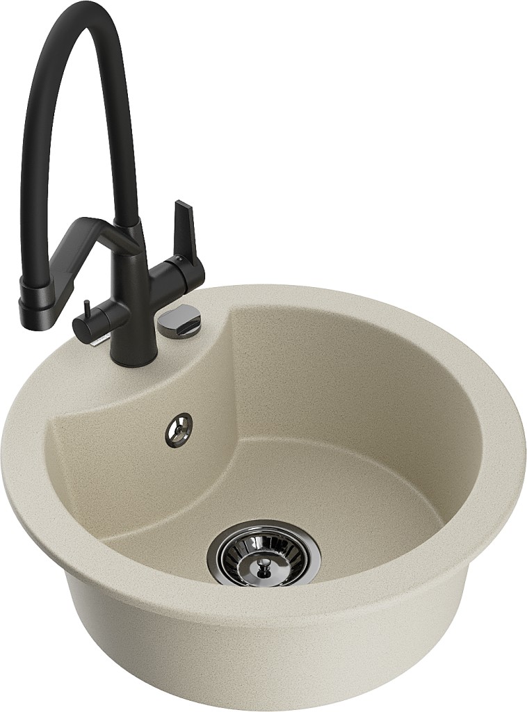 Technické dáta: Drez: Rozmer: 488x488x167 mm Hĺbka komory: 157 mm Šírka komory: 406 mm Priemer odtoku: ø90 mm Typ: 1-komorový Typ: Zapustené do pracovnej dosky Farba béžová Povrchová úprava sifónu: čierna Materiál: žula (80% žulové kamenivo 20% živice) Prepadový otvor: Áno Otvory: (batérie, automat) 2 Vysoká odolnosť proti poškriabaniu a zmene farby Odolnosť proti tepelným šokom Povrch pre ľahké čistenie Jeden dodatočný vyfrézovaný otvor na samodierovanie ø35 Kuchynská batéria: Materiál: mosadz Čierna farba Hlavy: Keramické Perlátor: Áno Typ výtoku: Flexibilný s mosadznou podperou Rozsah výtoku: 260 mm Výška: 405 mm Typ: Dve rukoväte Dvojhlavá batéria s prídavným filtrom na pitnú vodu(GT) Ean: 5905315101624