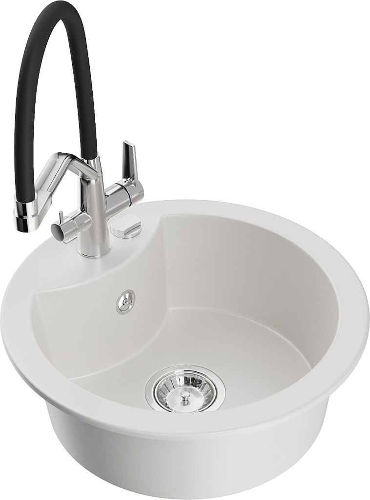 Technické dáta: drez: Rozmery: 488 x 488 x 167 mm Hĺbka komory: 157 mm Šírka komory: 406 mm Priemer odtoku: ø90 mm Typ: 1-komorový Typ: Zapustené do pracovnej dosky biela farba Povrchová úprava sifónu: Chrome Materiál: žula (80% žulové kamenivo, 20% živice) Prepadový otvor: Áno Otvory: (batérie, automatické) 2 Vysoká odolnosť proti poškriabaniu a zmene farby Odolnosť proti tepelným šokom Ľahko čistiteľný povrch Jeden dodatočný vyfrézovaný otvor na samodierovanie ø35 kuchynská batéria: Materiál: mosadz Farba: chróm/čierna Hlavy: Keramické Prevzdušňovač: Áno Typ hubica: Flexibilný s mosadzným držiakom Rozsah výtoku: 260 mm Výška: 405 mm Typ: Dve rukoväte Dvojhlavá batéria s prídavným filtrom na pitnú vodu(GT) Ean: 5905315101532