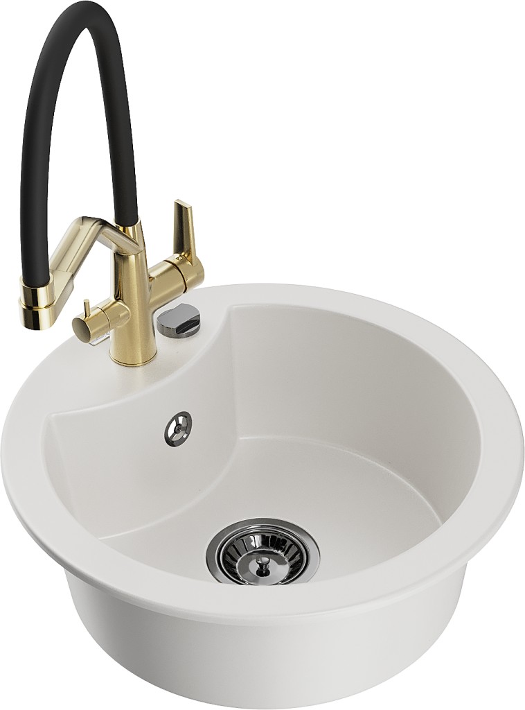 Technické dáta: drez: Rozmery: 488 x 488 x 167 mm Hĺbka komory: 157 mm Šírka komory: 406 mm Priemer odtoku: ø90 mm Typ: 1-komorový Typ: Zapustené do pracovnej dosky biela farba Povrchová úprava sifónu: čierna Materiál: žula (80% žulové kamenivo, 20% živice) Prepadový otvor: Áno Otvory: (batérie, automatické) 2 Vysoká odolnosť proti poškriabaniu a zmene farby Odolnosť proti tepelným šokom Ľahko čistiteľný povrch Jeden dodatočný vyfrézovaný otvor na samodierovanie ø35 kuchynská batéria: Materiál: mosadz Farba: Zlatá/Čierna Hlavy: Keramické Prevzdušňovač: Áno Typ hubica: Flexibilný s mosadzným držiakom Rozsah výtoku: 260 mm Výška: 405 mm Typ: Dve rukoväte Dvojhlavá batéria s prídavným filtrom na pitnú vodu(GT) Ean: 5905315101563