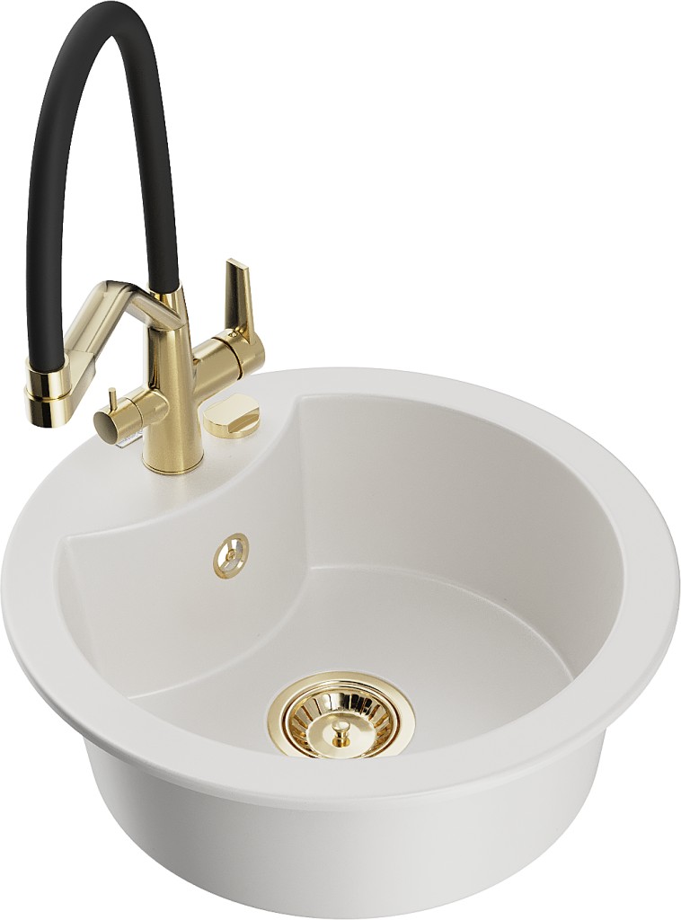Technické dáta: drez: Rozmery: 488 x 488 x 167 mm Hĺbka komory: 157 mm Šírka komory: 406 mm Priemer odtoku: ø90 mm Typ: 1-komorový Typ: Zapustené do pracovnej dosky biela farba Povrchová úprava sifónu: zlatá Materiál: žula (80% žulové kamenivo, 20% živice) Prepadový otvor: Áno Otvory: (batérie, automatické) 2 Vysoká odolnosť proti poškriabaniu a zmene farby Odolnosť proti tepelným šokom Ľahko čistiteľný povrch Jeden dodatočný vyfrézovaný otvor na samodierovanie ø35 kuchynská batéria: Materiál: mosadz Farba: Zlatá/Čierna Hlavy: Keramické Prevzdušňovač: Áno Typ hubica: Flexibilný s mosadzným držiakom Rozsah výtoku: 260 mm Výška: 405 mm Typ: Dve rukoväte Dvojhlavá batéria s prídavným filtrom na pitnú vodu(GT) Ean: 5905315101556