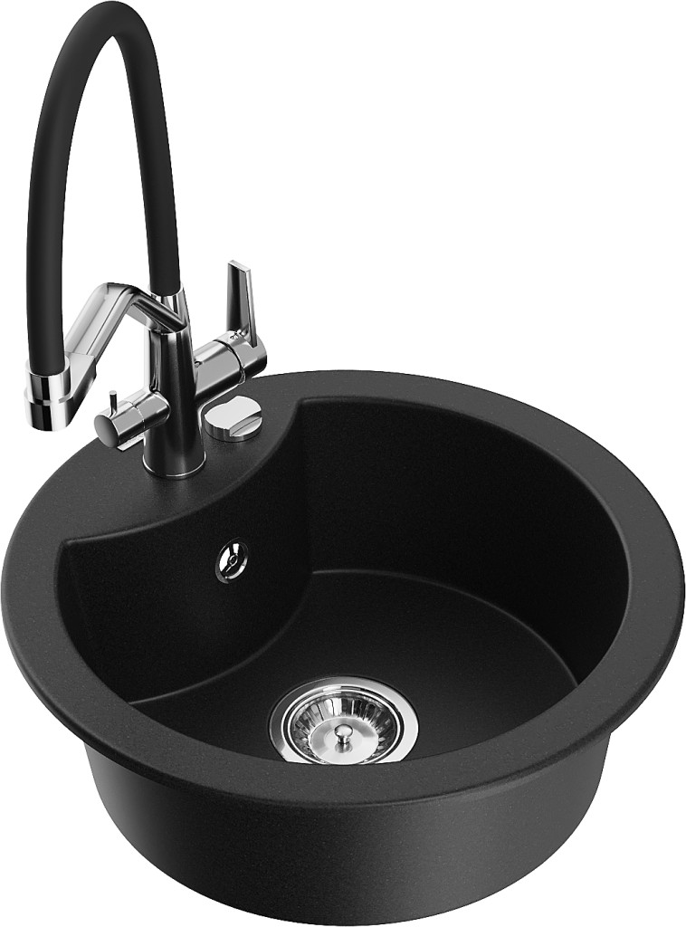 Technické dáta: drez: Rozmery: 488 x 488 x 167 mm Hĺbka komory: 157 mm Šírka komory: 406 mm Priemer odtoku: ø90 mm Typ: 1-komorový Typ: Zapustené do pracovnej dosky Čierna farba Povrchová úprava sifónu: Chrome Materiál: žula (80% žulové kamenivo, 20% živice) Prepadový otvor: Áno Otvory: (batérie, automatické) 2 Vysoká odolnosť proti poškriabaniu a zmene farby Odolnosť proti tepelným šokom Ľahko čistiteľný povrch Jeden dodatočný vyfrézovaný otvor na samodierovanie ø35 kuchynská batéria: Materiál: mosadz Farba: chróm/čierna Hlavy: Keramické Prevzdušňovač: Áno Typ hubica: Flexibilný s mosadzným držiakom Rozsah výtoku: 260 mm Výška: 405 mm Typ: Dve rukoväte Dvojhlavá batéria s prídavným filtrom na pitnú vodu(GT) Ean: 5905315101839