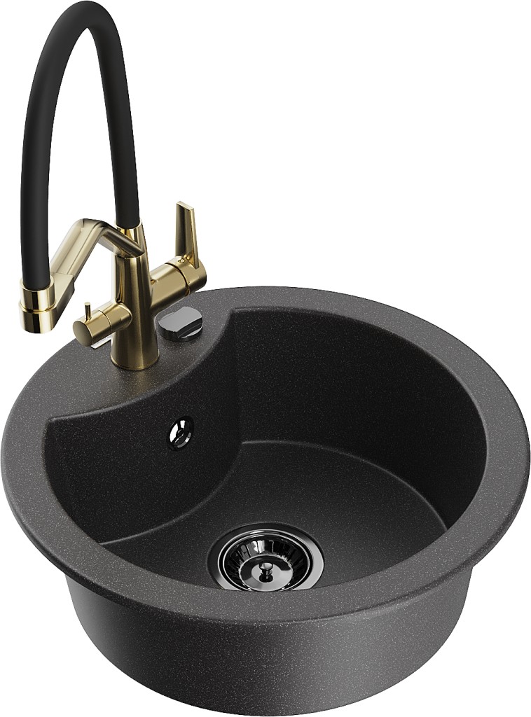 Technické dáta: drez: Rozmery: 488 x 488 x 167 mm Hĺbka komory: 157 mm Šírka komory: 406 mm Priemer odtoku: ø90 mm Typ: 1-komorový Typ: Zapustené do pracovnej dosky Farba: Škvrnitá čierna Povrchová úprava sifónu: čierna Materiál: žula (80% žulové kamenivo, 20% živice) Prepadový otvor: Áno Otvory: (batérie, automatické) 2 Vysoká odolnosť proti poškriabaniu a zmene farby Odolnosť proti tepelným šokom Ľahko čistiteľný povrch Jeden dodatočný vyfrézovaný otvor na samodierovanie ø35 kuchynská batéria: Materiál: mosadz Farba: Zlatá/Čierna Hlavy: Keramické Prevzdušňovač: Áno Typ hubica: Flexibilný s mosadzným držiakom Rozsah výtoku: 260 mm Výška: 405 mm Typ: Dve rukoväte Dvojhlavá batéria s prídavným filtrom na pitnú vodu(GT) Ean: 5905315101815