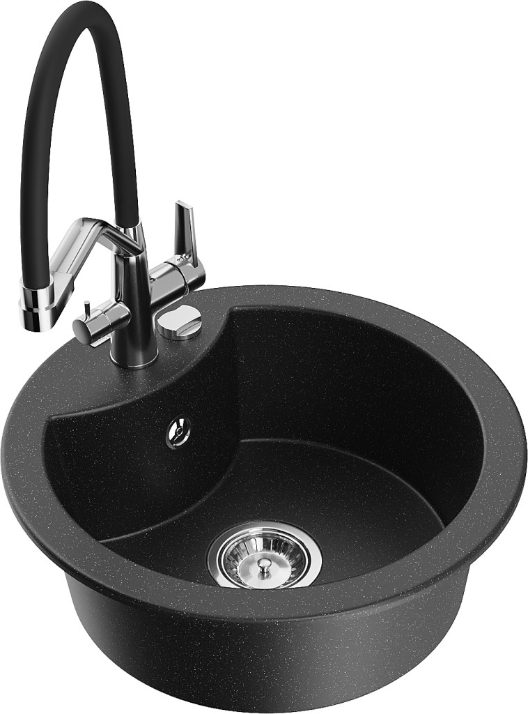 Technické dáta: drez: Rozmery: 488 x 488 x 167 mm Hĺbka komory: 157 mm Šírka komory: 406 mm Priemer odtoku: ø90 mm Typ: 1-komorový Typ: Zapustené do pracovnej dosky Farba: čierna/strieborná metalíza Povrchová úprava sifónu: Chrome Materiál: žula (80% žulové kamenivo, 20% živice) Prepadový otvor: Áno Otvory: (batérie, automatické) 2 Vysoká odolnosť proti poškriabaniu a zmene farby Odolnosť proti tepelným šokom Ľahko čistiteľný povrch Jeden dodatočný vyfrézovaný otvor na samodierovanie ø35 kuchynská batéria: Materiál: mosadz Farba: chróm/čierna Hlavy: Keramické Prevzdušňovač: Áno Typ hubica: Flexibilný s mosadzným držiakom Rozsah výtoku: 260 mm Výška: 405 mm Typ: Dve rukoväte Dvojhlavá batéria s prídavným filtrom na pitnú vodu(GT) Ean: 5905315101686