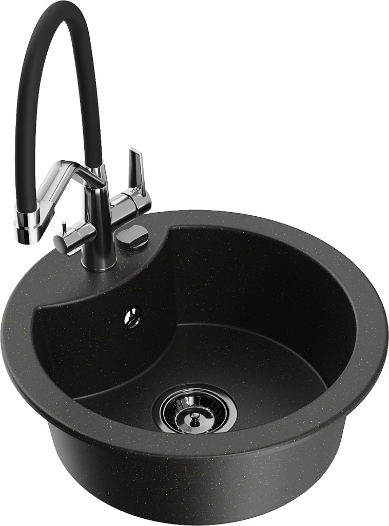 Technické dáta: drez: Rozmery: 488 x 488 x 167 mm Hĺbka komory: 157 mm Šírka komory: 406 mm Priemer odtoku: ø90 mm Typ: 1-komorový Typ: Zapustené do pracovnej dosky Farba: čierna / zlatá metalíza Povrchová úprava sifónu: čierna Materiál: žula (80% žulové kamenivo, 20% živice) Prepadový otvor: Áno Otvory: (batérie, automatické) 2 Vysoká odolnosť proti poškriabaniu a zmene farby Odolnosť proti tepelným šokom Ľahko čistiteľný povrch Jeden dodatočný vyfrézovaný otvor na samodierovanie ø35 kuchynská batéria: Materiál: mosadz Farba: chróm/čierna Hlavy: Keramické Prevzdušňovač: Áno Typ hubica: Flexibilný s mosadzným držiakom Rozsah výtoku: 260 mm Výška: 405 mm Typ: Dve rukoväte Dvojhlavá batéria s prídavným filtrom na pitnú vodu(GT) Ean: 5905315101747