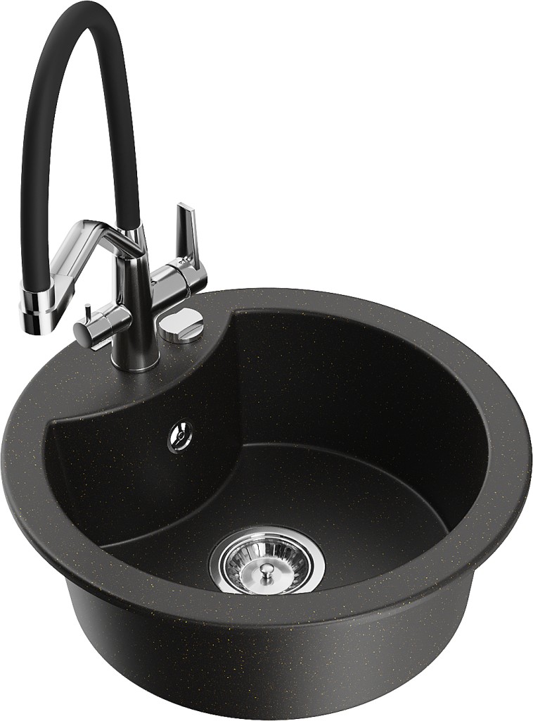 Technické dáta: drez: Rozmery: 488 x 488 x 167 mm Hĺbka komory: 157 mm Šírka komory: 406 mm Priemer odtoku: ø90 mm Typ: 1-komorový Typ: Zapustené do pracovnej dosky Farba: čierna / zlatá metalíza Povrchová úprava sifónu: Chrome Materiál: žula (80% žulové kamenivo, 20% živice) Prepadový otvor: Áno Otvory: (batérie, automatické) 2 Vysoká odolnosť proti poškriabaniu a zmene farby Odolnosť proti tepelným šokom Ľahko čistiteľný povrch Jeden dodatočný vyfrézovaný otvor na samodierovanie ø35 kuchynská batéria: Materiál: mosadz Farba: chróm/čierna Hlavy: Keramické Prevzdušňovač: Áno Typ hubica: Flexibilný s mosadzným držiakom Rozsah výtoku: 260 mm Výška: 405 mm Typ: Dve rukoväte Dvojhlavá batéria s prídavným filtrom na pitnú vodu(GT) Ean: 5905315101730