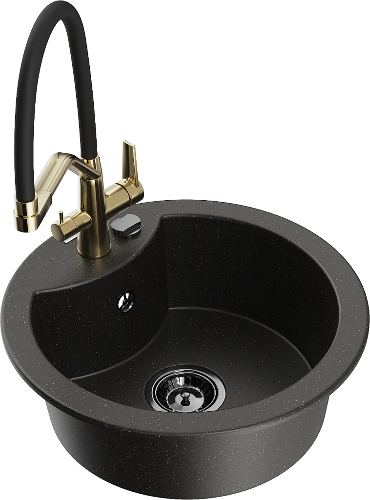 Technické dáta: drez: Rozmery: 488 x 488 x 167 mm Hĺbka komory: 157 mm Šírka komory: 406 mm Priemer odtoku: ø90 mm Typ: 1-komorový Typ: Zapustené do pracovnej dosky Farba: čierna / zlatá metalíza Povrchová úprava sifónu: čierna Materiál: žula (80% žulové kamenivo, 20% živice) Prepadový otvor: Áno Otvory: (batérie, automatické) 2 Vysoká odolnosť proti poškriabaniu a zmene farby Odolnosť proti tepelným šokom Ľahko čistiteľný povrch Jeden dodatočný vyfrézovaný otvor na samodierovanie ø35 kuchynská batéria: Materiál: mosadz Farba: Zlatá/Čierna Hlavy: Keramické Prevzdušňovač: Áno Typ hubica: Flexibilný s mosadzným držiakom Rozsah výtoku: 260 mm Výška: 405 mm Typ: Dve rukoväte Dvojhlavá batéria s prídavným filtrom na pitnú vodu(GT) Ean: 5905315101761