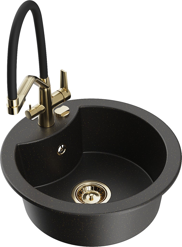 Technické dáta: drez: Rozmery: 488 x 488 x 167 mm Hĺbka komory: 157 mm Šírka komory: 406 mm Priemer odtoku: ø90 mm Typ: 1-komorový Typ: Zapustené do pracovnej dosky Farba: čierna / zlatá metalíza Povrchová úprava sifónu: zlatá Materiál: žula (80% žulové kamenivo, 20% živice) Prepadový otvor: Áno Otvory: (batérie, automatické) 2 Vysoká odolnosť proti poškriabaniu a zmene farby Odolnosť proti tepelným šokom Ľahko čistiteľný povrch Jeden dodatočný vyfrézovaný otvor na samodierovanie ø35 kuchynská batéria: Materiál: mosadz Farba: Zlatá/Čierna Hlavy: Keramické Prevzdušňovač: Áno Typ hubica: Flexibilný s mosadzným držiakom Rozsah výtoku: 260 mm Výška: 405 mm Typ: Dve rukoväte Dvojhlavá batéria s prídavným filtrom na pitnú vodu(GT) Ean: 5905315101754