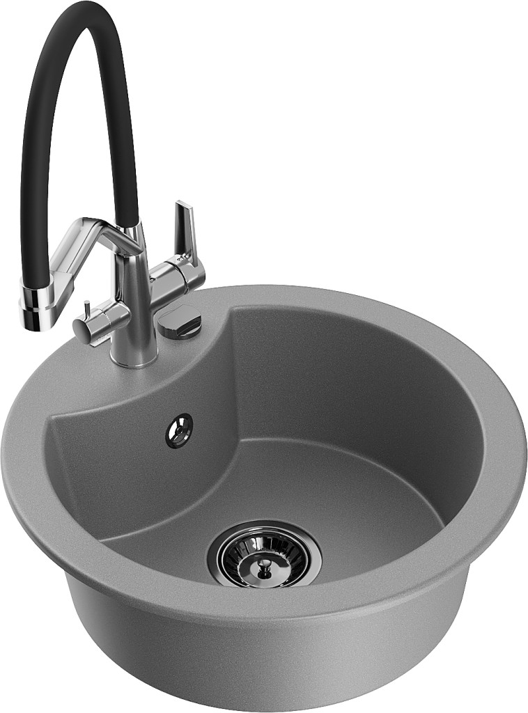 Technické dáta: drez: Rozmery: 488 x 488 x 167 mm Hĺbka komory: 157 mm Šírka komory: 406 mm Priemer odtoku: ø90 mm Typ: 1-komorový Typ: Zapustené do pracovnej dosky Šedá farba Povrchová úprava sifónu: čierna Materiál: žula (80% žulové kamenivo, 20% živice) Prepadový otvor: Áno Otvory: (batérie, automatické) 2 Vysoká odolnosť proti poškriabaniu a zmene farby Odolnosť proti tepelným šokom Ľahko čistiteľný povrch Jeden dodatočný vyfrézovaný otvor na samodierovanie ø35 kuchynská batéria: Materiál: mosadz Farba: chróm/čierna Hlavy: Keramické Prevzdušňovač: Áno Typ hubica: Flexibilný s mosadzným držiakom Rozsah výtoku: 260 mm Výška: 405 mm Typ: Dve rukoväte Dvojhlavá batéria s prídavným filtrom na pitnú vodu(GT) Ean: 5905315101648