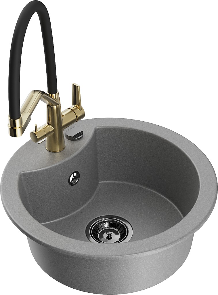 Technické dáta: drez: Rozmery: 488 x 488 x 167 mm Hĺbka komory: 157 mm Šírka komory: 406 mm Priemer odtoku: ø90 mm Typ: 1-komorový Typ: Zapustené do pracovnej dosky Šedá farba Povrchová úprava sifónu: čierna Materiál: žula (80% žulové kamenivo, 20% živice) Prepadový otvor: Áno Otvory: (batérie, automatické) 2 Vysoká odolnosť proti poškriabaniu a zmene farby Odolnosť proti tepelným šokom Ľahko čistiteľný povrch Jeden dodatočný vyfrézovaný otvor na samodierovanie ø35 kuchynská batéria: Materiál: mosadz Farba: Zlatá/Čierna Hlavy: Keramické Prevzdušňovač: Áno Typ hubica: Flexibilný s mosadzným držiakom Rozsah výtoku: 260 mm Výška: 405 mm Typ: Dve rukoväte Dvojhlavá batéria s prídavným filtrom na pitnú vodu(GT) Ean: 5905315101662