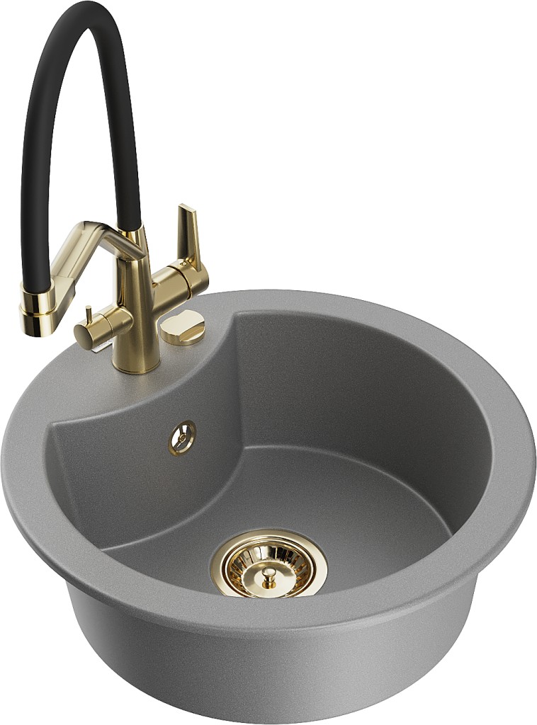 Technické dáta: drez: Rozmery: 488 x 488 x 167 mm Hĺbka komory: 157 mm Šírka komory: 406 mm Priemer odtoku: ø90 mm Typ: 1-komorový Typ: Zapustené do pracovnej dosky Šedá farba Povrchová úprava sifónu: zlatá Materiál: žula (80% žulové kamenivo, 20% živice) Prepadový otvor: Áno Otvory: (batérie, automatické) 2 Vysoká odolnosť proti poškriabaniu a zmene farby Odolnosť proti tepelným šokom Ľahko čistiteľný povrch Jeden dodatočný vyfrézovaný otvor na samodierovanie ø35 kuchynská batéria: Materiál: mosadz Farba: Zlatá/Čierna Hlavy: Keramické Prevzdušňovač: Áno Typ hubica: Flexibilný s mosadzným držiakom Rozsah výtoku: 260 mm Výška: 405 mm Typ: Dve rukoväte Dvojhlavá batéria s prídavným filtrom na pitnú vodu(GT) Ean: 5905315101655