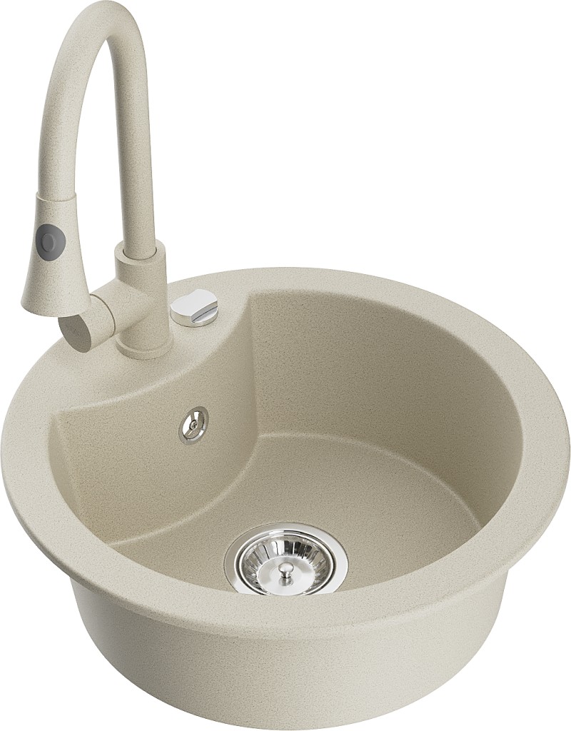 Technické dáta: Drez: Rozmer: 488x488x167 mm Hĺbka komory: 157 mm Šírka komory: 406 mm Priemer odtoku: ø90 mm Typ: 1-komorový Typ: Zapustené do pracovnej dosky Farba béžová Povrchová úprava sifónu: Chrome Materiál: žula (80% žulové kamenivo 20% živice) Prepadový otvor: Áno Otvory: (batérie, automat) 2 Vysoká odolnosť proti poškriabaniu a zmene farby Odolnosť proti tepelným šokom Povrch pre ľahké čistenie Jeden dodatočný vyfrézovaný otvor na samodierovanie ø35 Kuchynská batéria: Materiál: mosadz Farba béžová Hlava: Keramická Perlátor: Áno Typ: Jednopákové Výška batérie: 380 mm Rozsah výtoku: 252 mm Typ výtoku: Výsuvný(GT) Ean: 5905315030061