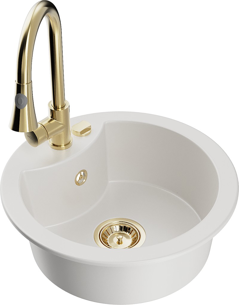 Technické dáta: drez: Rozmery: 488 x 488 x 167 mm Hĺbka komory: 157 mm Šírka komory: 406 mm Priemer odtoku: ø90 mm Typ: 1-komorový Typ: Zapustené do pracovnej dosky biela farba Povrchová úprava sifónu: zlatá Materiál: žula (80% žulové kamenivo, 20% živice) Prepadový otvor: Áno Otvory: (batérie, automatické) 2 Vysoká odolnosť proti poškriabaniu a zmene farby Odolnosť proti tepelným šokom Ľahko čistiteľný povrch Jeden dodatočný vyfrézovaný otvor na samodierovanie ø35 kuchynská batéria: Materiál: mosadz Farba: Zlatá Hlava: Keramická Prevzdušňovač: Áno Typ: Jedna páka Výška batérie: 380 mm Rozsah výtoku: 252 mm Typ výtoku: Výsuvný(GT) Ean: 5905315030030