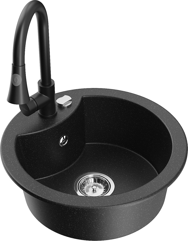 Technické dáta: drez: Rozmery: 488 x 488 x 167 mm Hĺbka komory: 157 mm Šírka komory: 406 mm Priemer odtoku: ø90 mm Typ: 1-komorový Typ: Zapustené do pracovnej dosky Farba: čierna/strieborná metalíza Povrchová úprava sifónu: Chrome Materiál: žula (80% žulové kamenivo, 20% živice) Prepadový otvor: Áno Otvory: (batérie, automatické) 2 Vysoká odolnosť proti poškriabaniu a zmene farby Odolnosť proti tepelným šokom Ľahko čistiteľný povrch Jeden dodatočný vyfrézovaný otvor na samodierovanie ø35 kuchynská batéria: Materiál: mosadz Čierna farba Hlava: Keramická Prevzdušňovač: Áno Typ: Jedna páka Výška batérie: 380 mm Rozsah výtoku: 252 mm Typ výtoku: Výsuvný(GT) Ean: 5905315030177