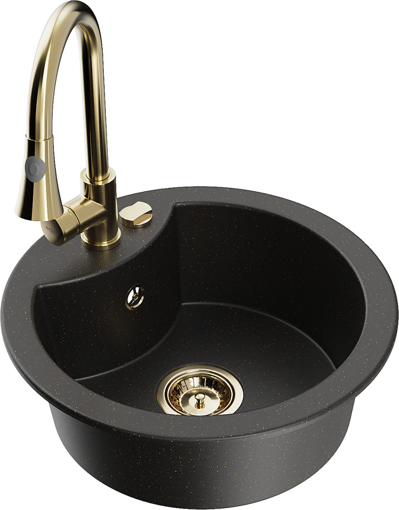 Technické dáta: drez: Rozmery: 488 x 488 x 167 mm Hĺbka komory: 157 mm Šírka komory: 406 mm Priemer odtoku: ø90 mm Typ: 1-komorový Typ: Zapustené do pracovnej dosky Farba: čierna / zlatá metalíza Povrchová úprava sifónu: zlatá Materiál: žula (80% žulové kamenivo, 20% živice) Prepadový otvor: Áno Otvory: (batérie, automatické) 2 Vysoká odolnosť proti poškriabaniu a zmene farby Odolnosť proti tepelným šokom Ľahko čistiteľný povrch Jeden dodatočný vyfrézovaný otvor na samodierovanie ø35 kuchynská batéria: Materiál: mosadz Farba: Zlatá Hlava: Keramická Prevzdušňovač: Áno Typ: Jedna páka Výška batérie: 380 mm Rozsah výtoku: 252 mm Typ výtoku: Výsuvný(GT) Ean: 5905315030191