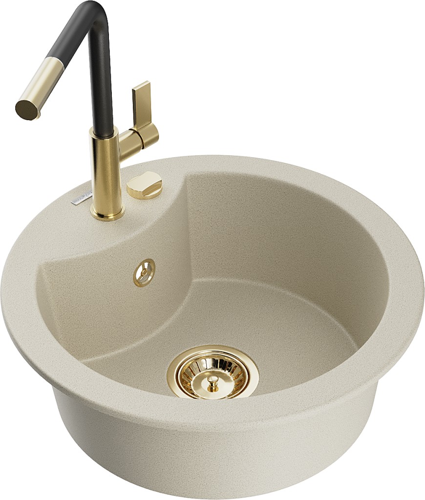 Technické dáta: Drez: Rozmer: 488x488x167 mm Hĺbka komory: 157 mm Šírka komory: 406 mm Priemer odtoku: ø90 mm Typ: 1-komorový Typ: Zapustené do pracovnej dosky Farba béžová Povrchová úprava sifónu: zlatá Materiál: žula (80% žulové kamenivo 20% živice) Prepadový otvor: Áno Otvory: (batérie, automat) 2 Vysoká odolnosť proti poškriabaniu a zmene farby Odolnosť proti tepelným šokom Povrch pre ľahké čistenie Jeden dodatočný vyfrézovaný otvor na samodierovanie ø35 Kuchynská batéria: Materiál: mosadz Farba: Zlatá/Čierna Hlava: Keramická Perlátor: Áno Typ: Jednopáková Rozsah výtoku: 245 mm Výška batérie: 307 mm(GT) Ean: 5905315060570