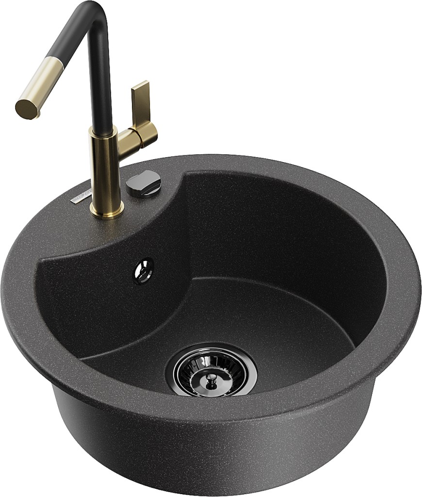 Technické dáta: drez: Rozmery: 488 x 488 x 167 mm Hĺbka komory: 157 mm Šírka komory: 406 mm Priemer odtoku: ø90 mm Typ: 1-komorový Typ: Zapustené do pracovnej dosky Farba: Škvrnitá čierna Povrchová úprava sifónu: čierna Materiál: žula (80% žulové kamenivo, 20% živice) Prepadový otvor: Áno Otvory: (batérie, automatické) 2 Vysoká odolnosť proti poškriabaniu a zmene farby Odolnosť proti tepelným šokom Ľahko čistiteľný povrch Jeden dodatočný vyfrézovaný otvor na samodierovanie ø35 kuchynská batéria: Materiál: mosadz Farba: Zlatá/Čierna Hlava: Keramická Prevzdušňovač: Áno Typ: Jedna páka Rozsah výtoku: 245 mm Výška batérie: 307 mm(GT) Ean: 5905315060853