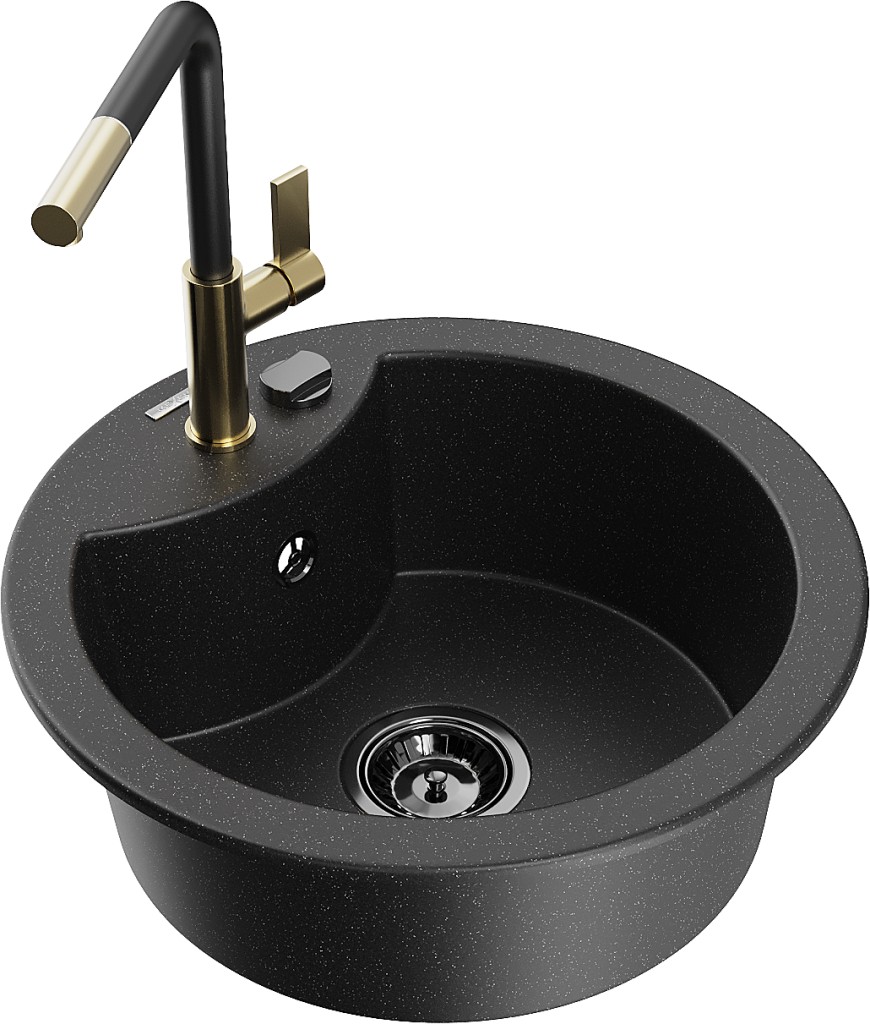 Technické dáta: drez: Rozmery: 488 x 488 x 167 mm Hĺbka komory: 157 mm Šírka komory: 406 mm Priemer odtoku: ø90 mm Typ: 1-komorový Typ: Zapustené do pracovnej dosky Farba: čierna/strieborná metalíza Povrchová úprava sifónu: čierna Materiál: žula (80% žulové kamenivo, 20% živice) Prepadový otvor: Áno Otvory: (batérie, automatické) 2 Vysoká odolnosť proti poškriabaniu a zmene farby Odolnosť proti tepelným šokom Ľahko čistiteľný povrch Jeden dodatočný vyfrézovaný otvor na samodierovanie ø35 kuchynská batéria: Materiál: mosadz Farba: Zlatá/Čierna Hlava: Keramická Prevzdušňovač: Áno Typ: Jedna páka Rozsah výtoku: 245 mm Výška batérie: 307 mm(GT) Ean: 5905315060716