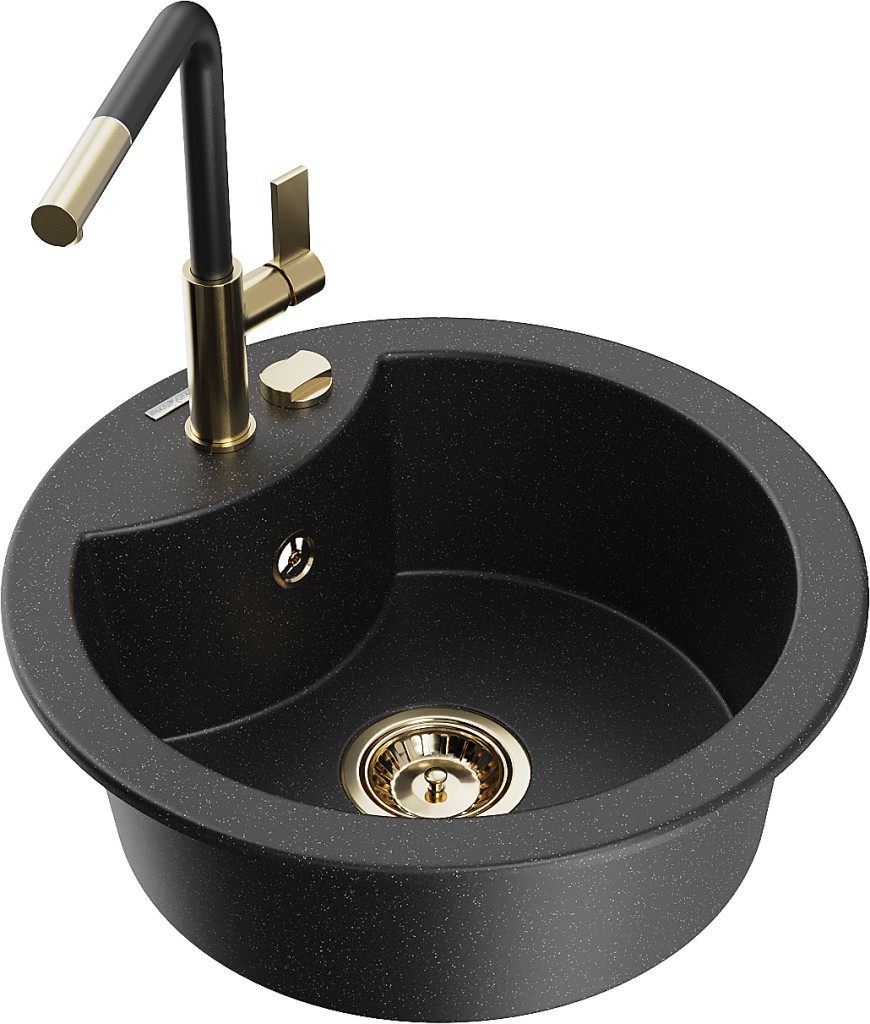 Technické dáta: drez: Rozmery: 488 x 488 x 167 mm Hĺbka komory: 157 mm Šírka komory: 406 mm Priemer odtoku: ø90 mm Typ: 1-komorový Typ: Zapustené do pracovnej dosky Farba: čierna/strieborná metalíza Povrchová úprava sifónu: zlatá Materiál: žula (80% žulové kamenivo, 20% živice) Prepadový otvor: Áno Otvory: (batérie, automatické) 2 Vysoká odolnosť proti poškriabaniu a zmene farby Odolnosť proti tepelným šokom Ľahko čistiteľný povrch Jeden dodatočný vyfrézovaný otvor na samodierovanie ø35 kuchynská batéria: Materiál: mosadz Farba: Zlatá/Čierna Hlava: Keramická Prevzdušňovač: Áno Typ: Jedna páka Rozsah výtoku: 245 mm Výška batérie: 307 mm(GT) Ean: 5905315060709