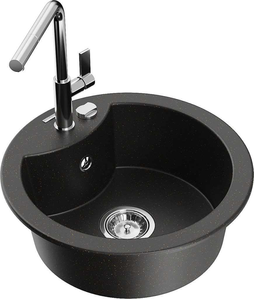 Technické dáta: drez: Rozmery: 488 x 488 x 167 mm Hĺbka komory: 157 mm Šírka komory: 406 mm Priemer odtoku: ø90 mm Typ: 1-komorový Typ: Zapustené do pracovnej dosky Farba: čierna / zlatá metalíza Povrchová úprava sifónu: Chrome Materiál: žula (80% žulové kamenivo, 20% živice) Prepadový otvor: Áno Otvory: (batérie, automatické) 2 Vysoká odolnosť proti poškriabaniu a zmene farby Odolnosť proti tepelným šokom Ľahko čistiteľný povrch Jeden dodatočný vyfrézovaný otvor na samodierovanie ø35 kuchynská batéria: Materiál: mosadz Farba: Chrome Hlava: Keramická Prevzdušňovač: Áno Typ: Jedna páka Rozsah výtoku: 245 mm Výška batérie: 307 mm(GT) Ean: 5905315060730