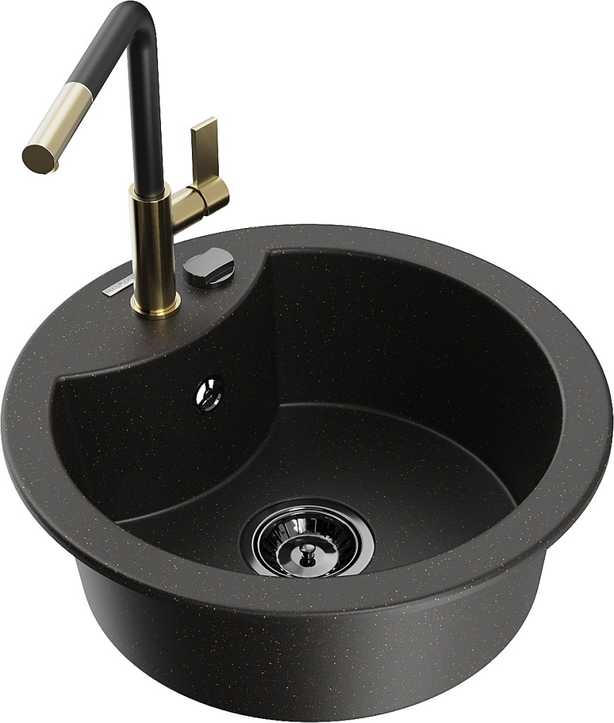 Technické dáta: drez: Rozmery: 488 x 488 x 167 mm Hĺbka komory: 157 mm Šírka komory: 406 mm Priemer odtoku: ø90 mm Typ: 1-komorový Typ: Zapustené do pracovnej dosky Farba: čierna / zlatá metalíza Povrchová úprava sifónu: čierna Materiál: žula (80% žulové kamenivo, 20% živice) Prepadový otvor: Áno Otvory: (batérie, automatické) 2 Vysoká odolnosť proti poškriabaniu a zmene farby Odolnosť proti tepelným šokom Ľahko čistiteľný povrch Jeden dodatočný vyfrézovaný otvor na samodierovanie ø35 kuchynská batéria: Materiál: mosadz Farba: Zlatá/Čierna Hlava: Keramická Prevzdušňovač: Áno Typ: Jedna páka Rozsah výtoku: 245 mm Výška batérie: 307 mm(GT) Ean: 5905315060778