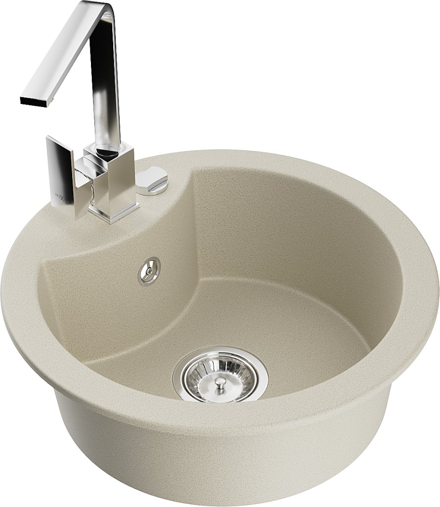 Technické dáta: Drez: Rozmer: 488x488x167 mm Hĺbka komory: 157 mm Šírka komory: 406 mm Priemer odtoku: ø90 mm Typ: 1-komorový Typ: Zapustené do pracovnej dosky Farba béžová Povrchová úprava sifónu: Chrome Materiál: žula (80% žulové kamenivo 20% živice) Prepadový otvor: Áno Otvory: (batérie, automat) 2 Vysoká odolnosť proti poškriabaniu a zmene farby Odolnosť proti tepelným šokom Povrch pre ľahké čistenie Jeden dodatočný vyfrézovaný otvor na samodierovanie ø35 Kuchynská batéria: Materiál: mosadz Farba: Chrome Hlava: Keramická Perlátor: Áno Typ: Jednopákové Výška batérie: 290 mm Rozsah výtoku: 220 mm(GT) Ean: 5905315019813