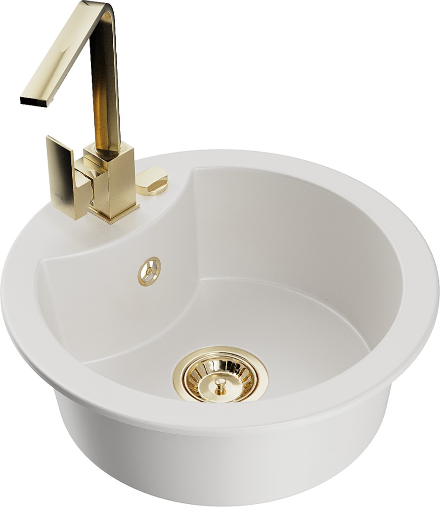 Technické dáta: drez: Rozmery: 488 x 488 x 167 mm Hĺbka komory: 157 mm Šírka komory: 406 mm Priemer odtoku: ø90 mm Typ: 1-komorový Typ: Zapustené do pracovnej dosky biela farba Povrchová úprava sifónu: zlatá Materiál: žula (80% žulové kamenivo, 20% živice) Prepadový otvor: Áno Otvory: (batérie, automatické) 2 Vysoká odolnosť proti poškriabaniu a zmene farby Odolnosť proti tepelným šokom Ľahko čistiteľný povrch Jeden dodatočný vyfrézovaný otvor na samodierovanie ø35 kuchynská batéria: Materiál: mosadz Farba: Zlatá Hlava: Keramická Prevzdušňovač: Áno Typ: Jedna páka Výška batérie: 290 mm Rozsah výtoku: 220 mm(GT) Ean: 5905315019790