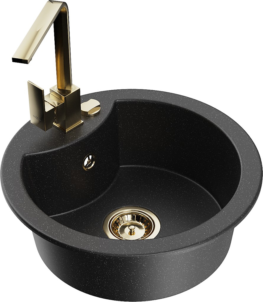 Technické dáta: drez: Rozmery: 488 x 488 x 167 mm Hĺbka komory: 157 mm Šírka komory: 406 mm Priemer odtoku: ø90 mm Typ: 1-komorový Typ: Zapustené do pracovnej dosky Farba: čierna/strieborná metalíza Povrchová úprava sifónu: zlatá Materiál: žula (80% žulové kamenivo, 20% živice) Prepadový otvor: Áno Otvory: (batérie, automatické) 2 Vysoká odolnosť proti poškriabaniu a zmene farby Odolnosť proti tepelným šokom Ľahko čistiteľný povrch Jeden dodatočný vyfrézovaný otvor na samodierovanie ø35 kuchynská batéria: Materiál: mosadz Farba: Zlatá Hlava: Keramická Prevzdušňovač: Áno Typ: Jedna páka Výška batérie: 290 mm Rozsah výtoku: 220 mm(GT) Ean: 5905315019912