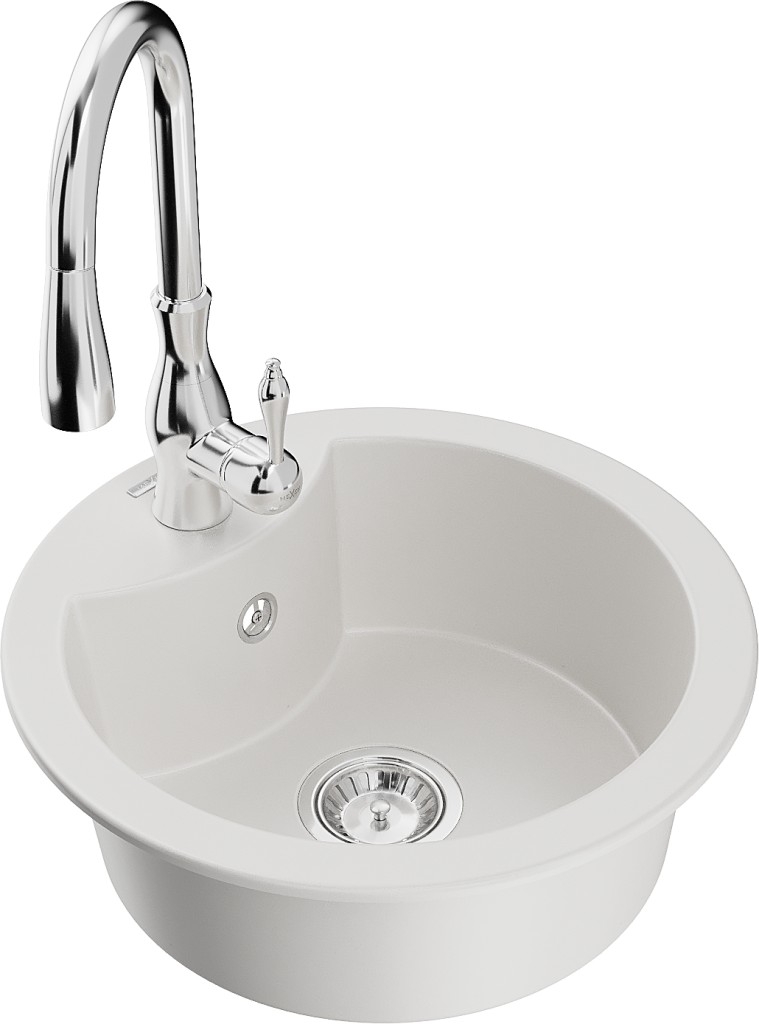 Technické dáta: drez: Rozmery: 488 x 488 x 167 mm Hĺbka komory: 157 mm Šírka komory: 406 mm Priemer odtoku: ø90 mm Typ: 1-komorový Typ: Zapustené do pracovnej dosky biela farba Povrchová úprava sifónu: Chrome Materiál: žula (80% žulové kamenivo, 20% živice) Prepadový otvor: Áno Otvory: (batérie, automatické) 2 Vysoká odolnosť proti poškriabaniu a zmene farby Odolnosť proti tepelným šokom Ľahko čistiteľný povrch Jeden dodatočný vyfrézovaný otvor na samodierovanie ø35 kuchynská batéria: Materiál: mosadz Farba: Chrome Hlava: Keramická Prevzdušňovač: Áno Typ: Jedna páka Výška batérie: 410 mm Rozsah výtoku: 231 mm(GT) Ean: 5905315035127