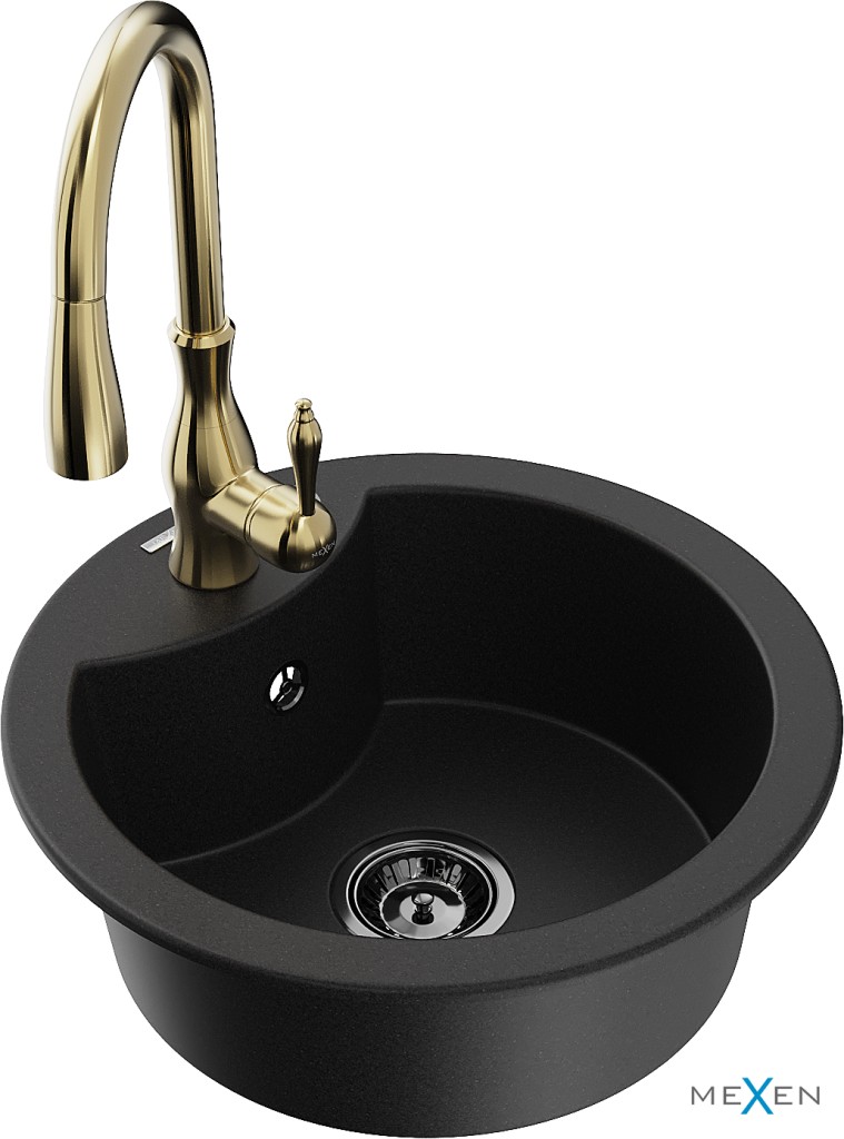 Technické dáta: drez: Rozmery: 488 x 488 x 167 mm Hĺbka komory: 157 mm Šírka komory: 406 mm Priemer odtoku: ø90 mm Typ: 1-komorový Typ: Zapustené do pracovnej dosky Čierna farba Povrchová úprava sifónu: čierna Materiál: žula (80% žulové kamenivo, 20% živice) Prepadový otvor: Áno Otvory: (batérie, automatické) 2 Vysoká odolnosť proti poškriabaniu a zmene farby Odolnosť proti tepelným šokom Ľahko čistiteľný povrch Jeden dodatočný vyfrézovaný otvor na samodierovanie ø35 kuchynská batéria: Materiál: mosadz Farba: Zlatá Hlava: Keramická Prevzdušňovač: Áno Typ: Jedna páka Výška batérie: 410 mm Rozsah výtoku: 231 mm(GT) Ean: 5905315035417