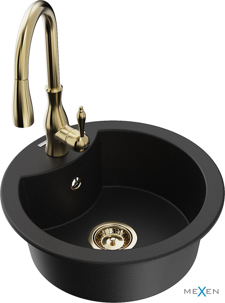 Technické dáta: drez: Rozmery: 488 x 488 x 167 mm Hĺbka komory: 157 mm Šírka komory: 406 mm Priemer odtoku: ø90 mm Typ: 1-komorový Typ: Zapustené do pracovnej dosky Čierna farba Povrchová úprava sifónu: zlatá Materiál: žula (80% žulové kamenivo, 20% živice) Prepadový otvor: Áno Otvory: (batérie, automatické) 2 Vysoká odolnosť proti poškriabaniu a zmene farby Odolnosť proti tepelným šokom Ľahko čistiteľný povrch Jeden dodatočný vyfrézovaný otvor na samodierovanie ø35 kuchynská batéria: Materiál: mosadz Farba: Zlatá Hlava: Keramická Prevzdušňovač: Áno Typ: Jedna páka Výška batérie: 410 mm Rozsah výtoku: 231 mm(GT) Ean: 5905315035400