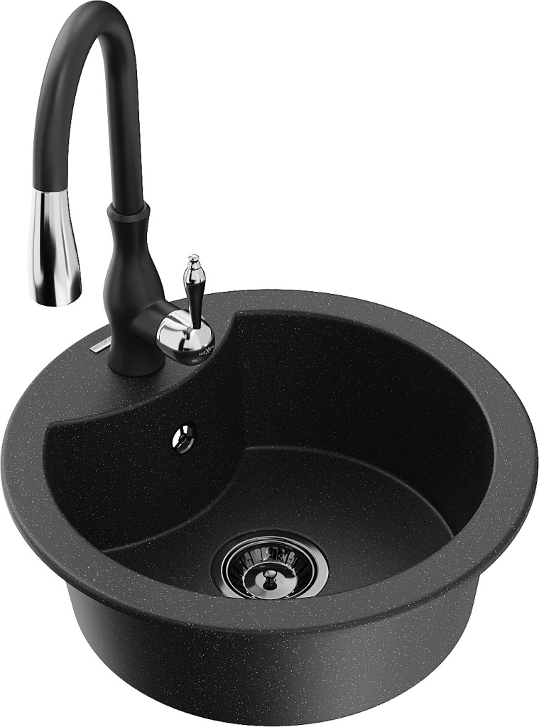 Technické dáta: drez: Rozmery: 488 x 488 x 167 mm Hĺbka komory: 157 mm Šírka komory: 406 mm Priemer odtoku: ø90 mm Typ: 1-komorový Typ: Zapustené do pracovnej dosky Farba: čierna/strieborná metalíza Povrchová úprava sifónu: čierna Materiál: žula (80% žulové kamenivo, 20% živice) Prepadový otvor: Áno Otvory: (batérie, automatické) 2 Vysoká odolnosť proti poškriabaniu a zmene farby Odolnosť proti tepelným šokom Ľahko čistiteľný povrch Jeden dodatočný vyfrézovaný otvor na samodierovanie ø35 kuchynská batéria: Materiál: mosadz Čierna farba Hlava: Keramická Prevzdušňovač: Áno Typ: Jedna páka Výška batérie: 410 mm Rozsah výtoku: 231 mm(GT) Ean: 5905315035271