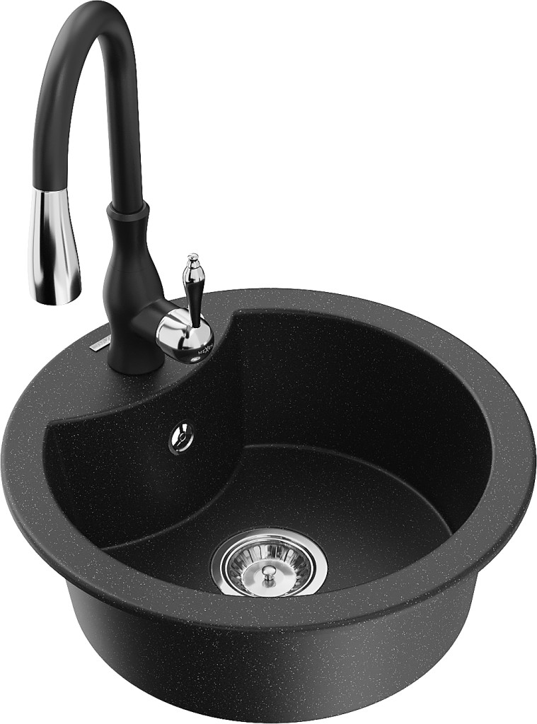 Technické dáta: drez: Rozmery: 488 x 488 x 167 mm Hĺbka komory: 157 mm Šírka komory: 406 mm Priemer odtoku: ø90 mm Typ: 1-komorový Typ: Zapustené do pracovnej dosky Farba: čierna/strieborná metalíza Povrchová úprava sifónu: Chrome Materiál: žula (80% žulové kamenivo, 20% živice) Prepadový otvor: Áno Otvory: (batérie, automatické) 2 Vysoká odolnosť proti poškriabaniu a zmene farby Odolnosť proti tepelným šokom Ľahko čistiteľný povrch Jeden dodatočný vyfrézovaný otvor na samodierovanie ø35 kuchynská batéria: Materiál: mosadz Čierna farba Hlava: Keramická Prevzdušňovač: Áno Typ: Jedna páka Výška batérie: 410 mm Rozsah výtoku: 231 mm(GT) Ean: 5905315035288