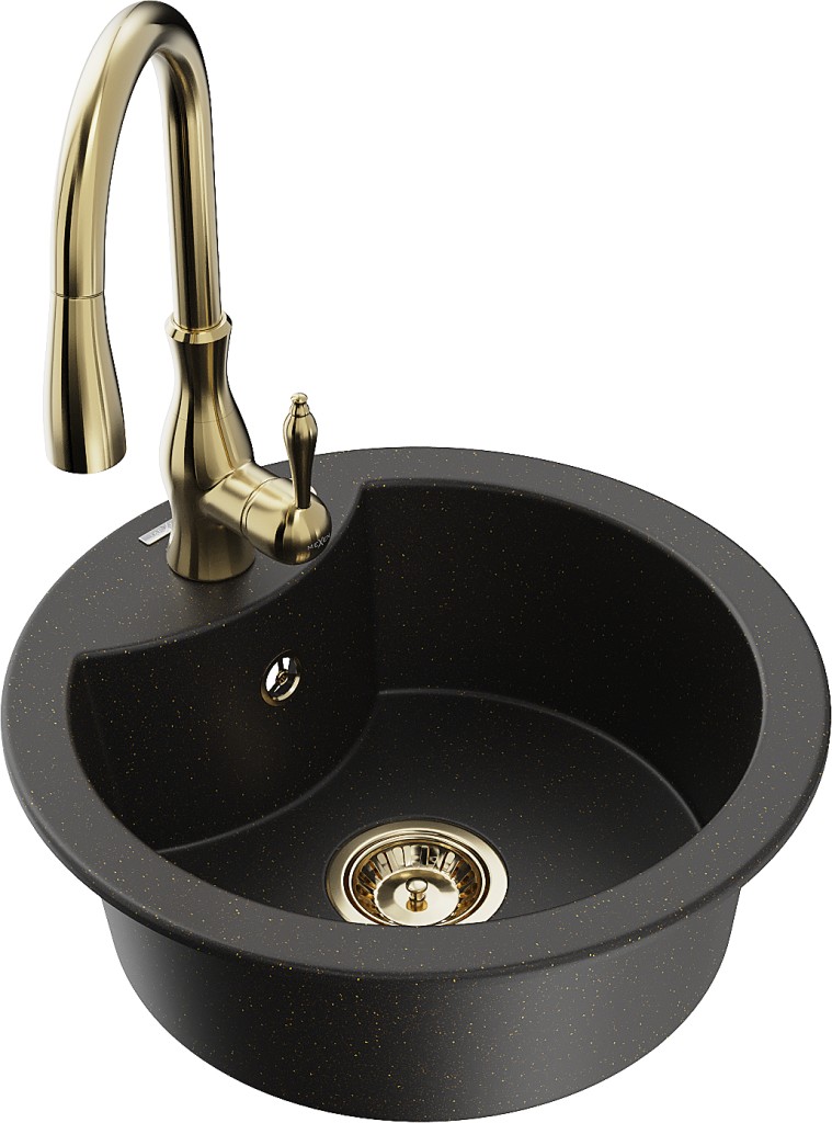 Technické dáta: drez: Rozmery: 488 x 488 x 167 mm Hĺbka komory: 157 mm Šírka komory: 406 mm Priemer odtoku: ø90 mm Typ: 1-komorový Typ: Zapustené do pracovnej dosky Farba: čierna / zlatá metalíza Povrchová úprava sifónu: zlatá Materiál: žula (80% žulové kamenivo, 20% živice) Prepadový otvor: Áno Otvory: (batérie, automatické) 2 Vysoká odolnosť proti poškriabaniu a zmene farby Odolnosť proti tepelným šokom Ľahko čistiteľný povrch Jeden dodatočný vyfrézovaný otvor na samodierovanie ø35 kuchynská batéria: Materiál: mosadz Farba: Zlatá Hlava: Keramická Prevzdušňovač: Áno Typ: Jedna páka Výška batérie: 410 mm Rozsah výtoku: 231 mm(GT) Ean: 5905315035301