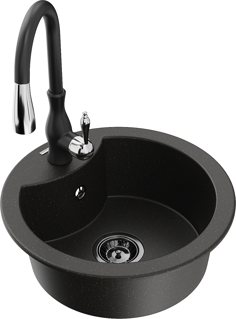 Technické dáta: drez: Rozmery: 488 x 488 x 167 mm Hĺbka komory: 157 mm Šírka komory: 406 mm Priemer odtoku: ø90 mm Typ: 1-komorový Typ: Zapustené do pracovnej dosky Farba: čierna / zlatá metalíza Povrchová úprava sifónu: čierna Materiál: žula (80% žulové kamenivo, 20% živice) Prepadový otvor: Áno Otvory: (batérie, automatické) 2 Vysoká odolnosť proti poškriabaniu a zmene farby Odolnosť proti tepelným šokom Ľahko čistiteľný povrch Jeden dodatočný vyfrézovaný otvor na samodierovanie ø35 kuchynská batéria: Materiál: mosadz Čierna farba Hlava: Keramická Prevzdušňovač: Áno Typ: Jedna páka Výška batérie: 410 mm Rozsah výtoku: 231 mm(GT) Ean: 5905315035325