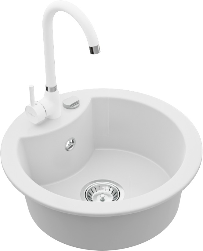 Technické dáta: drez: Rozmery: 488 x 488 x 167 mm Hĺbka komory: 157 mm Šírka komory: 406 mm Priemer odtoku: ø90 mm Typ: 1-komorový Typ: Zapustené do pracovnej dosky biela farba Povrchová úprava sifónu: Chrome Materiál: žula (80% žulové kamenivo, 20% živice) Prepadový otvor: Áno Otvory: (batérie, automatické) 2 Vysoká odolnosť proti poškriabaniu a zmene farby Odolnosť proti tepelným šokom Ľahko čistiteľný povrch Jeden dodatočný vyfrézovaný otvor na samodierovanie ø35 kuchynská batéria: Materiál: mosadz biela farba Hlava: Keramická Prevzdušňovač: Áno Výška batérie: 335 mm Rozsah výtoku: 180 mm(GT) Ean: 5907709160477