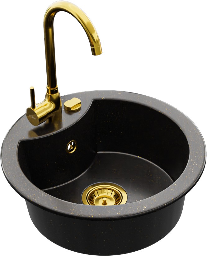 Technické dáta: drez: Rozmery: 488 x 488 x 167 mm Hĺbka komory: 157 mm Šírka komory: 406 mm Priemer odtoku: ø90 mm Typ: 1-komorový Typ: Zapustené do pracovnej dosky Farba: čierna / zlatá metalíza Povrchová úprava sifónu: zlatá Materiál: žula (80% žulové kamenivo, 20% živice) Prepadový otvor: Áno Otvory: (batérie, automatické) 2 Vysoká odolnosť proti poškriabaniu a zmene farby Odolnosť proti tepelným šokom Ľahko čistiteľný povrch Jeden dodatočný vyfrézovaný otvor na samodierovanie ø35 kuchynská batéria: Materiál: mosadz Farba: Zlatá Hlava: Keramická Prevzdušňovač: Áno Výška batérie: 335 mm Rozsah výtoku: 180 mm(GT) Ean: 5907709160545