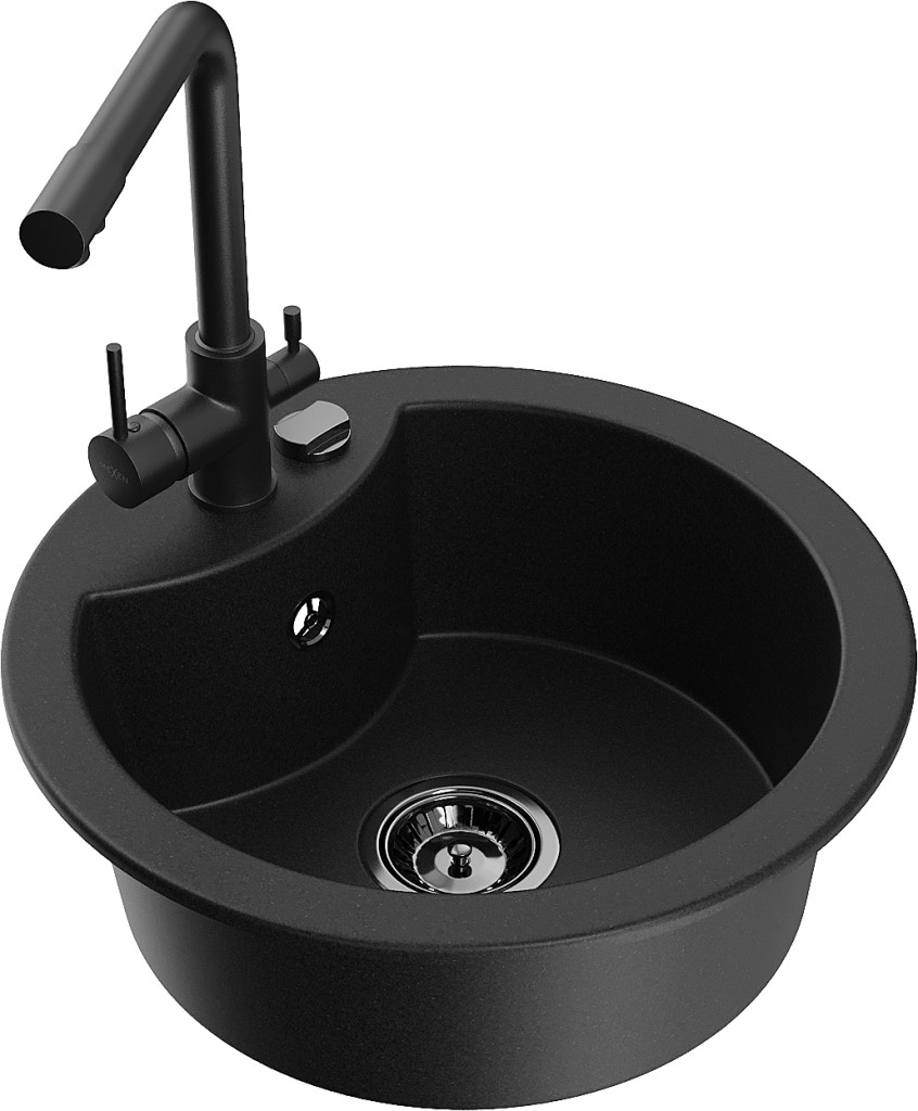 Technické dáta: drez: Rozmery: 488 x 488 x 167 mm Hĺbka komory: 157 mm Šírka komory: 406 mm Priemer odtoku: ø90 mm Typ: 1-komorový Typ: Zapustené do pracovnej dosky Čierna farba Povrchová úprava sifónu: čierna Materiál: žula (80% žulové kamenivo, 20% živice) Prepadový otvor: Áno Otvory: (batérie, automatické) 2 Vysoká odolnosť proti poškriabaniu a zmene farby Odolnosť proti tepelným šokom Ľahko čistiteľný povrch Jeden dodatočný vyfrézovaný otvor na samodierovanie ø35 kuchynská batéria: Materiál: mosadz Čierna farba Hlava: Keramická Prevzdušňovač: Áno Typ: Dve rukoväte Rozsah výtoku: 235 mm Výška batérie: 315 mm Dvojhlavá batéria s prídavným kanálom pre filtrovanú pitnú vodu(GT) Ean: 5905315025197