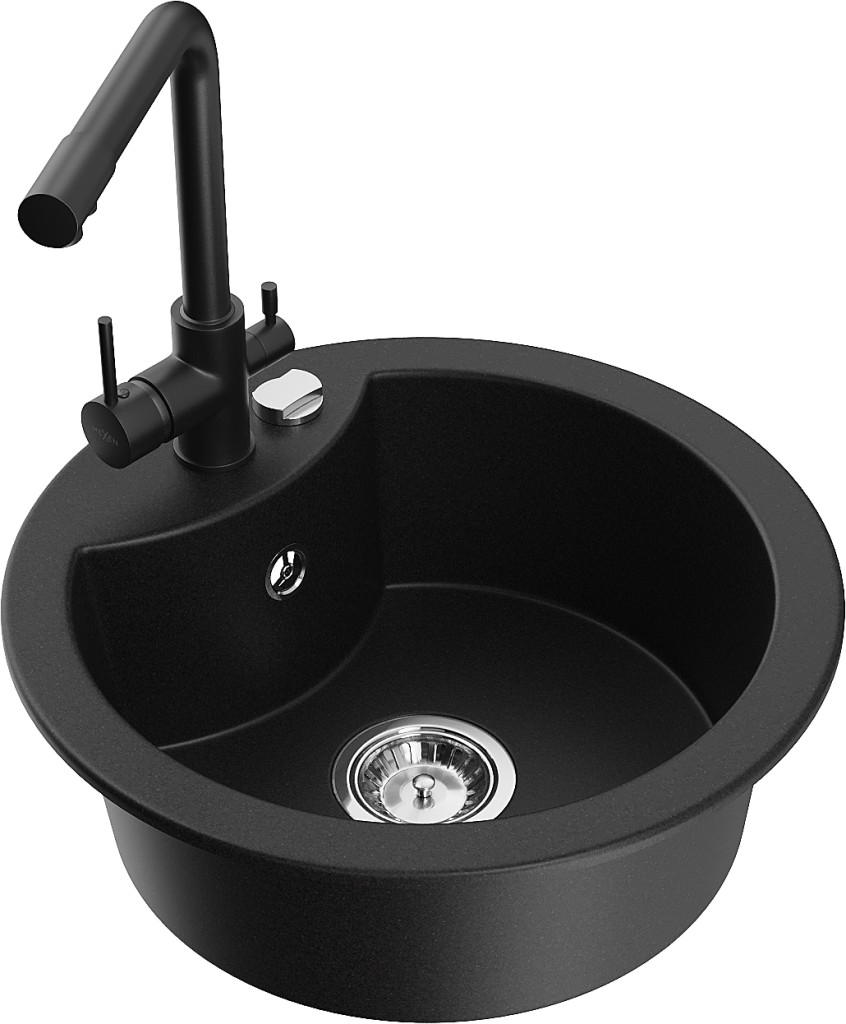 Technické dáta: drez: Rozmery: 488 x 488 x 167 mm Hĺbka komory: 157 mm Šírka komory: 406 mm Priemer odtoku: ø90 mm Typ: 1-komorový Typ: Zapustené do pracovnej dosky Čierna farba Povrchová úprava sifónu: Chrome Materiál: žula (80% žulové kamenivo, 20% živice) Prepadový otvor: Áno Otvory: (batérie, automatické) 2 Vysoká odolnosť proti poškriabaniu a zmene farby Odolnosť proti tepelným šokom Ľahko čistiteľný povrch Jeden dodatočný vyfrézovaný otvor na samodierovanie ø35 kuchynská batéria: Materiál: mosadz Čierna farba Hlava: Keramická Prevzdušňovač: Áno Typ: Dve rukoväte Rozsah výtoku: 235 mm Výška batérie: 315 mm Dvojhlavá batéria s prídavným kanálom pre filtrovanú pitnú vodu(GT) Ean: 5905315025203
